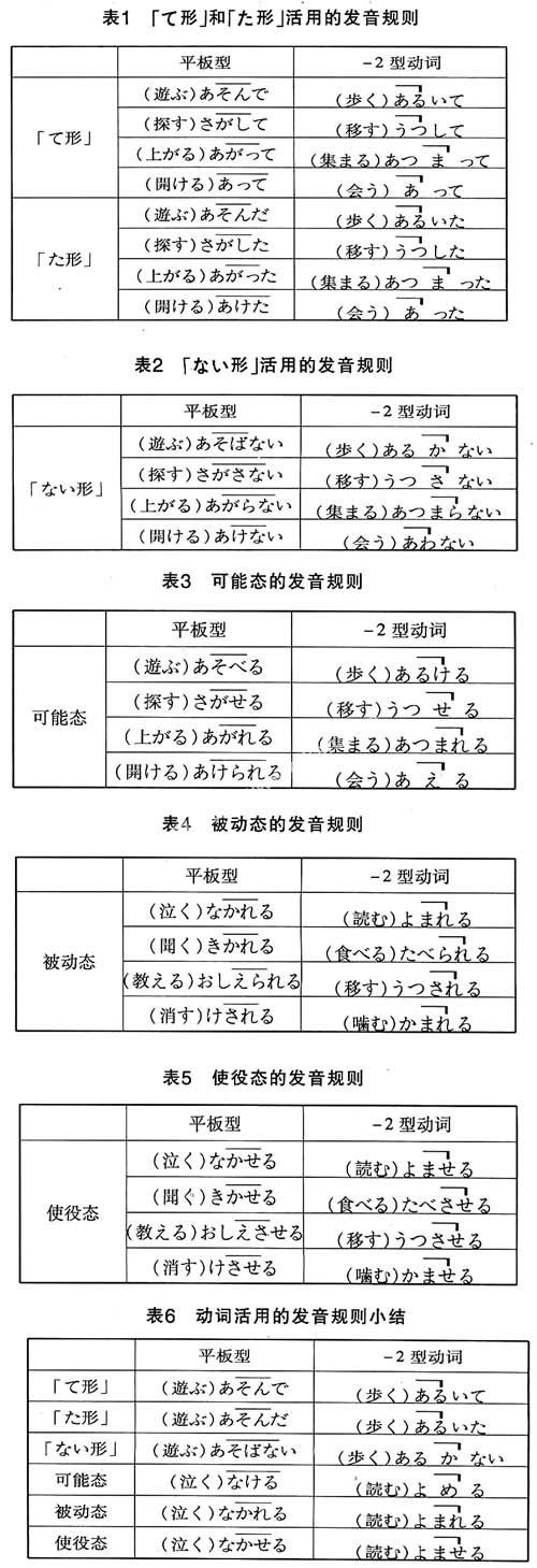 可见,动词的可能态、被动态、使役态的规律是一样的。概括起来就是:平板型动词的可能态、被动态、使役态动词的发音还是平板型;-2型动词的可能态、被动态、使役态动词的发音还是-2型。加上前面的「て形」「た形」「ない形」一起总结如下表:
