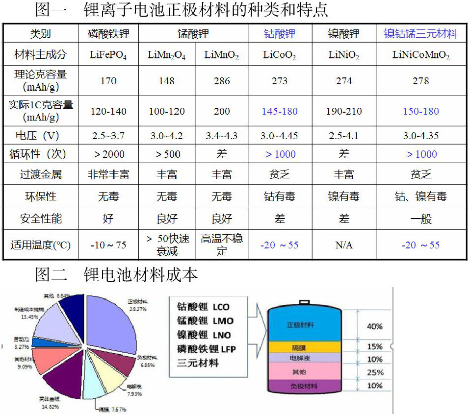 锂离子电池主要由正极材料(图一)、负极材料、电解液、隔膜等主要材料构成。一般来说,在锂离子电池产品组成成分中,正极材料占据着最重要的地位,正极材料的好坏,直接决定了最终锂离子电池产品的性能指标。而正极材料在电池成本中所占比例高达40%左右(图二),成为制约我国高性能锂离子电池发展的瓶颈。从正极材料的发展趋势来看,早期主要为技术竞争,而中、长期仍然还是需要重点关注成本竞争。在目前行业规模逐步增大的趋势发展状态下,锂离子正极材料的制造成本成为市场竞争的关键,而降低成本成为目前正极材料发展不变的战略。本文通过对现有锂离子电池正极材料生产工艺进行优化改进或新工艺探索,实现锂离子电池正极材料制造成本的降低,并确认工艺优化的方向。