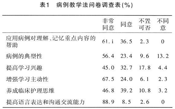 摘要: 为激发学生学习的兴趣及主动性,提高学生的语言表达和沟通交流能力,笔者以我校2006级高级护理专业345名学生为研究对象,在内科护理学理论教学各个环节中应用病例教学方式贯穿于整个教学过程中,并自编调查问卷进行反馈调查,发现91.5%的学生认为能增强学习主动性,97.4 %的学生认为提高了语言表达和沟通交流能力。可见这种形式增强了教学的知识性和实践性,提高了学生分析问题、解决问题的能力及语言表达和沟通交流能力,较好地促进了教学质量的提高。