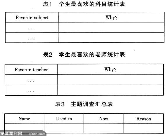 思路:让学生在课堂上用英语谈论自己的校园生活,特别是自己喜欢的科目、老师等有关学习的内容,这些话题是他们熟悉的,符合他们的生活经验,容易引起他们的兴趣。通过统计,能够引起学生的进一步思考,也为学生创设了语言运用的环境。