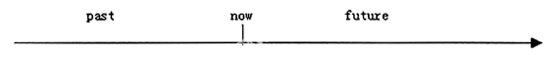 其实除了上面的这些问题,我们对于现在时的理解还存在另外一个误区:我们通常在划分时态的时候把现在时看作一个时间点,这也存在一定的问题。比如概念隐语理论在对英语时态进行解读的时候就把英语的时态的划分等同于距离,该理论把说话的某一时刻定义为现在时,并以该时刻为零界点,在此时刻之前的动作和状态为过去时,在此时刻之后的状态和动作是将来时,图示下: