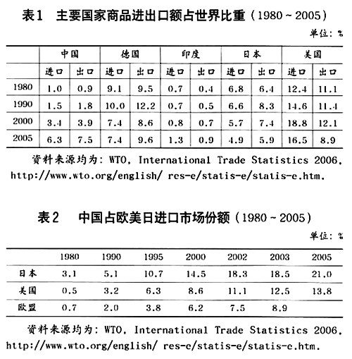第三,对全球的外部性效应。首先,从中国对世界经济增长的贡献来看,根据世界银行数据库(2006)计算,2000~2004年中国对世界GDP(按购买力平价计算)新增量的贡献率为23.1%,排在美国(17.1%)、欧盟(9.8%)和日本(3.9%)之前,成为第一大贡献者。其次,从中国对世界贸易增长的贡献来看,2000~2004年中国对世界商品和服务贸易出口额新增量的贡献率为11.3%,排在美国(24.1%)和德国(12.6%)之后,成为第三大贡献者;中国对世界商品和服务贸易进口额新增量的贡献率为11.2%,排在美国(10.0%)和德国(8.9%)之前,成为第一贡献者。我们估计,到2010年,中国将可能成为世界第二大商品贸易出口国,超过美国,排在德国之后;将可能成为世界第二大商品贸易进口国,超过德国,排在美国之后;届时,中国进出口额约占世界总量比重的1/10左右。
